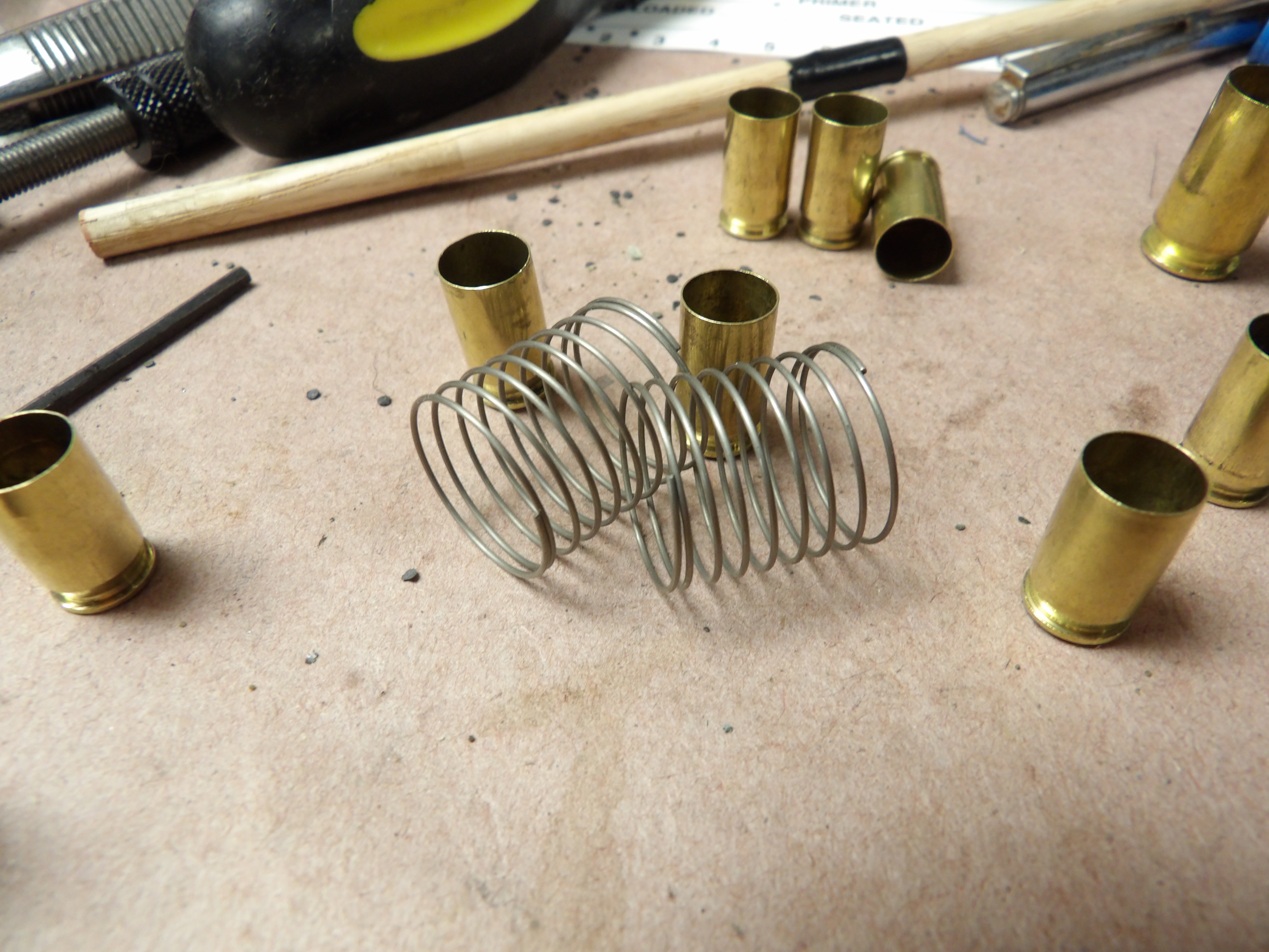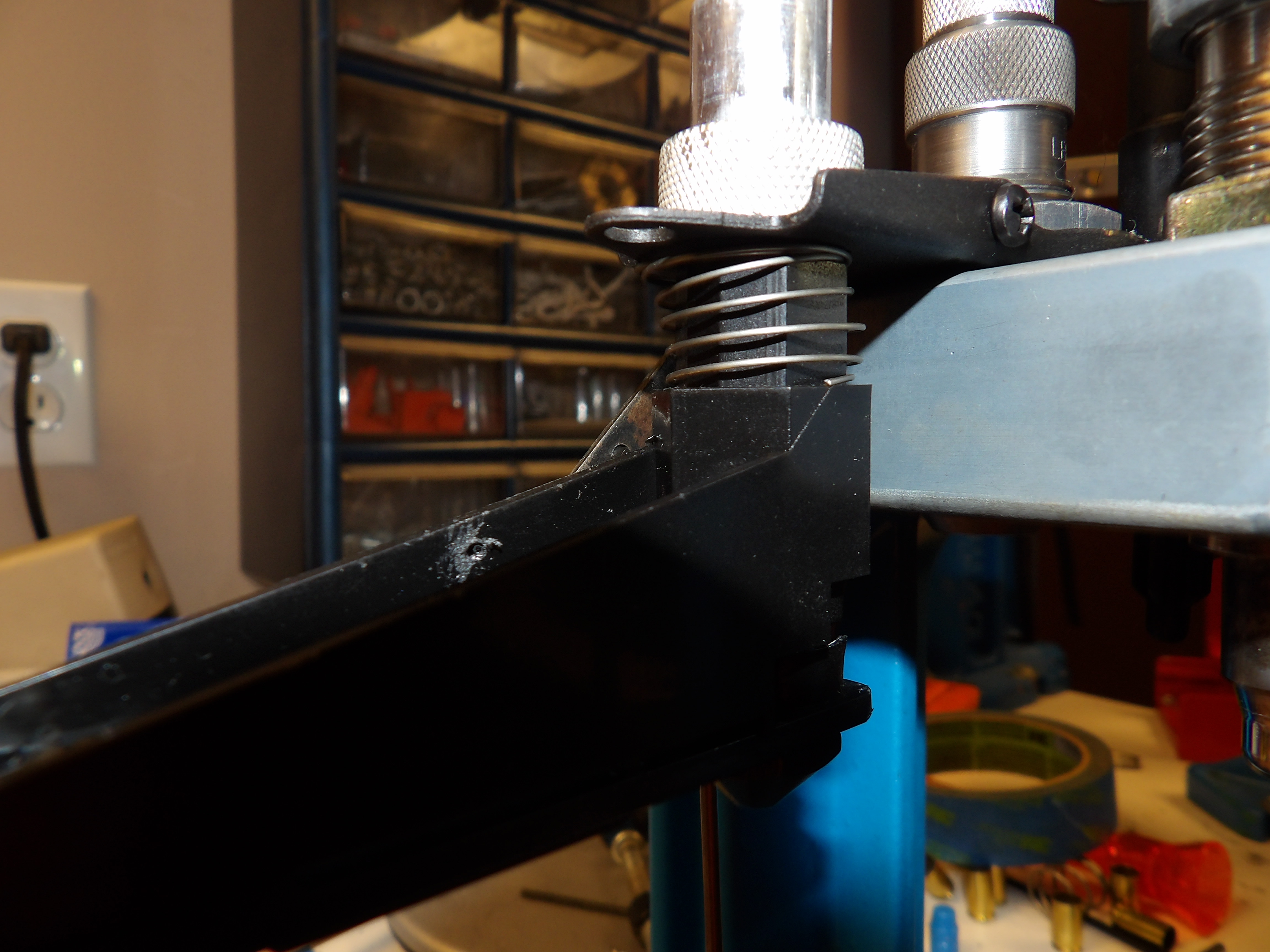 What I did was use a fine wire round weak spring and place it between the arm and mounting plate to the die and bullet tube. Fits right over and pushes down perfectly with even force. Nothing can interfere with the arm now as it used to. Might be something to consider in the future for an already excellent product. Some pics attached.