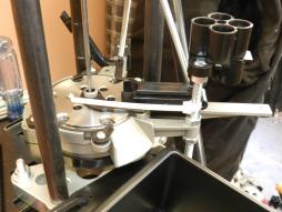 If you put a zip tie around the case feed mounting post (see attached photo) or slow down, this will help guide the completed rounds to the bin.